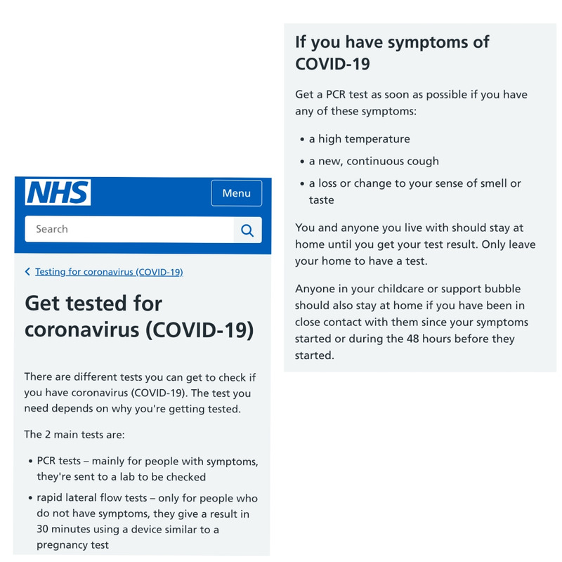 さて、コロナ検査の種類は症状がある場合(PCR test)と症状がない場合(rapid lateral flow test)で分かれます。症状というのは以下の3つですが、この中で1つでもあれば、PCR検査になるようです。