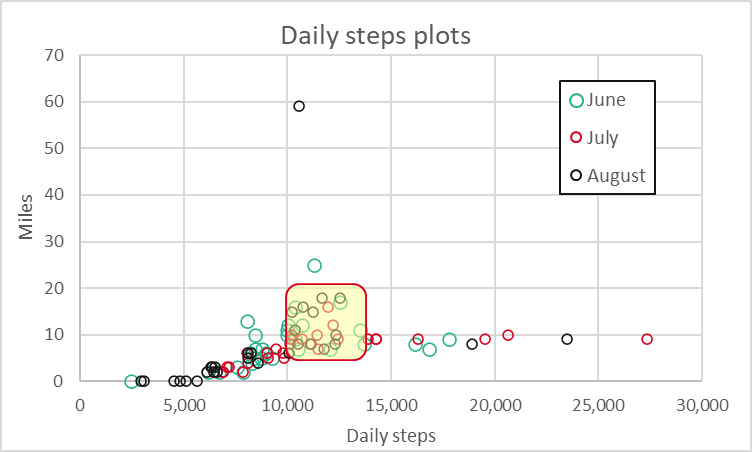 1日当たりの歩数と抽選も含めた獲得マイルをグラフにしてみました。当然、6,000マイル未満はゼロ、6,000-8,000マイルは2マイル、8,000-10,000マイルは多くて8マイル程度。図に四角くハイライトしているのですが、10,000マイルを超えると、たまに16-18マイルもらえていました!🥰 逆に 15,000マイルを超えても、10マイル程度しかもらえていませんでした。