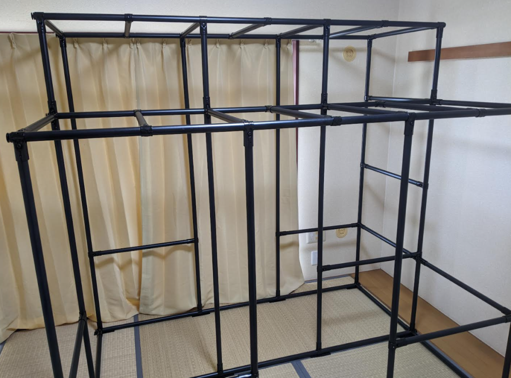 パイプは 1mm 単位で注文できるので、ジョイントの余剰分を考えたそうです(寸法の計算方法)。以前無料で使えっていた3D CADが有料になってしまったため、手書きで頑張っていました。残念ながら、ジョイント数の注文は間違えたようで、Amazonで追加していました。畳が傷つかないようにラバーマットを敷いています。課題は掃除です。旦那がいるときに持ち上げないと、ほこりが完全に取れません😫